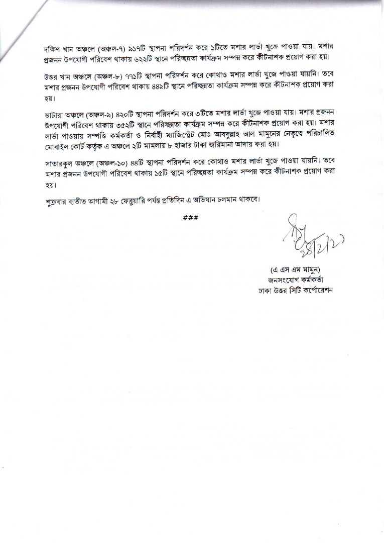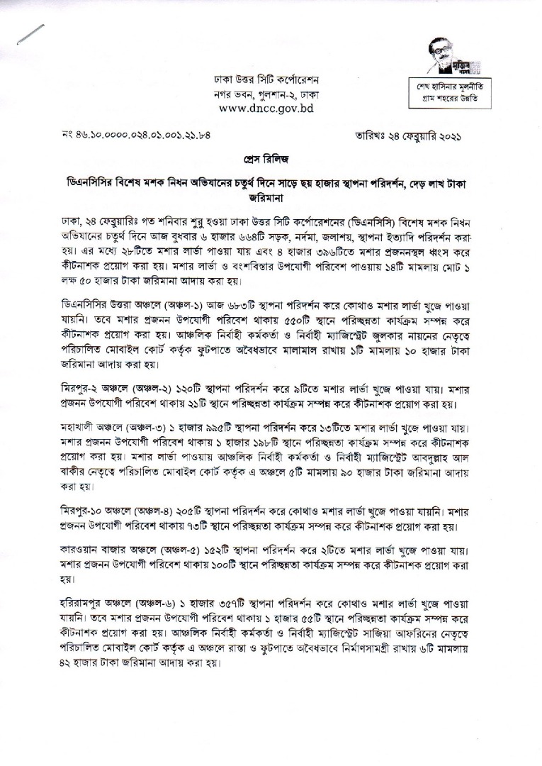 ডিএনসিসির বিশেষ মশক নিধন অভিযানের চতুর্থ দিনে সাড়ে ছয় হাজার স্থাপনা পরিদর্শন, দেড় লাখ টাকা জরিমানা।